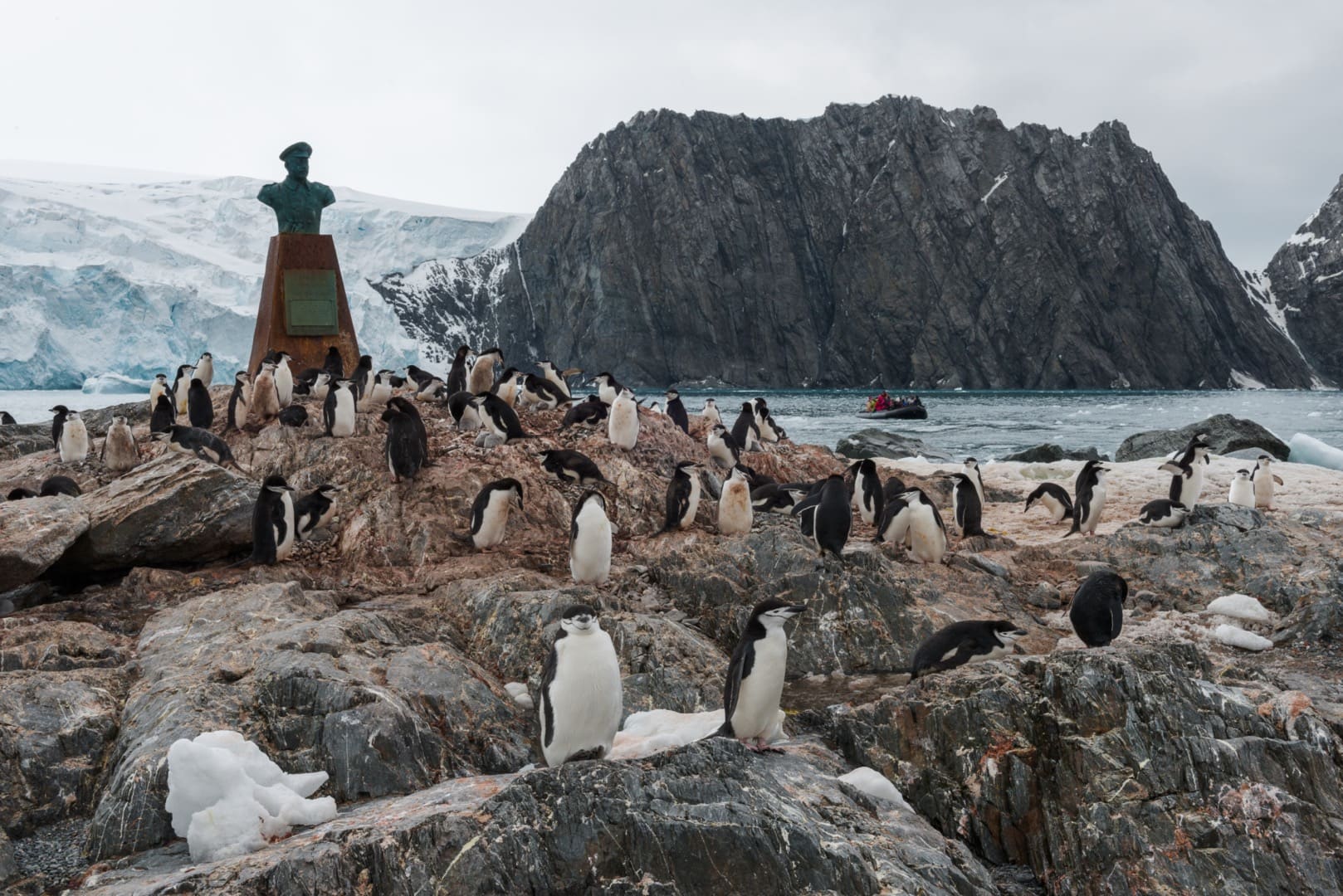 Zügelpinguine auf Elephant Island. Hier harrte Shackletons Mannschaft fünf Monate aus, bis zur Rettung durch den chilenischen Kapitän Pardo, an den die Büste im Hintergrund erinnert. (© Vreni & Stefan Gerber)