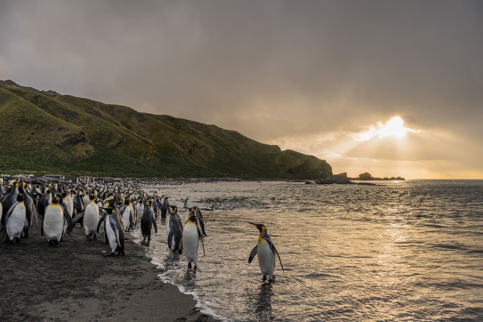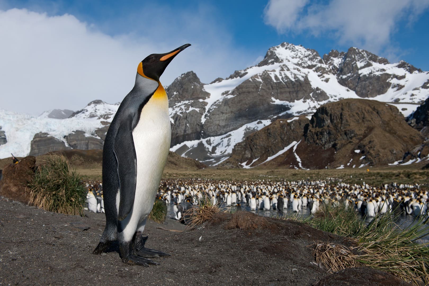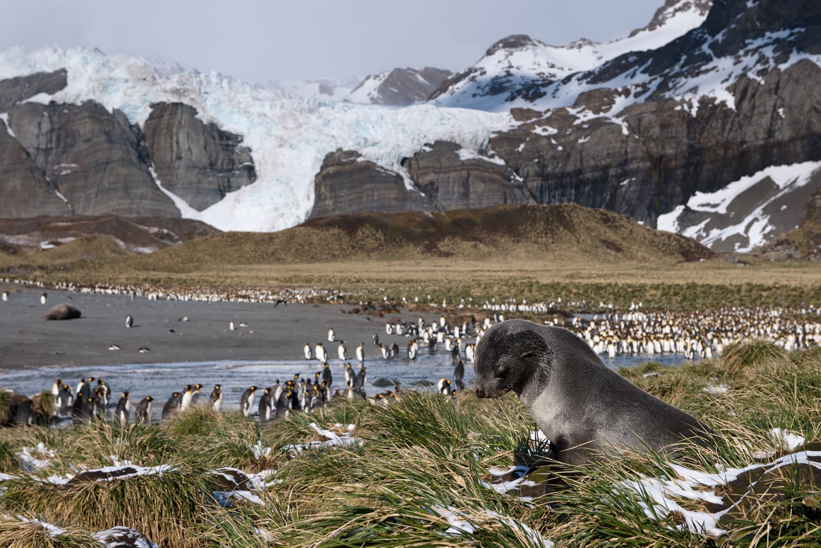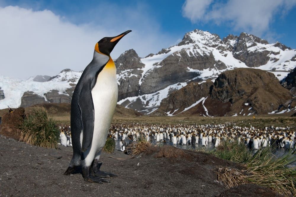 In der Subantarktis, inmitten des Südatlantiks, liegt Südgeorgien, 160 km lange und 30 km breite pure Wildnis, zerklüftet, gebirgig. Südgeorgien vom Schiff aus, das sieht ein bisschen so aus, als hätte man die Alpen ins südliche Polarmeer versetzt: Bis 2000 Meter ragen die dramatischen, schneebedeckten Gipfel in den Himmel, dazwischen 160 Gletscher, deren eisige Bänder ins Meer fliessen. Kaum von Menschen bevölkert, dafür umso mehr von den grossartigen Königspinguinen. Knapp eine Million Tiere sollen es sein, die in riesigen Kolonien zusammenleben. Bei St Andrews Bay und Salisbury Plain finden wir die berühmtesten Königspinguinkolonien auf Südgeorgien und sicherlich auch die berühmtesten Pinguinkolonien der Welt. Dicht an dicht stehen sie hier bis weit ins Tal und bis hoch an die grünen Flanken der umliegenden Berge. Bilder, die sich einem für immer einprägen. Doch noch um ein Vielfaches imposanter ist die Anzahl der Goldschopfpinguine, die hier leben, bis zu 5 Millionen Exemplare. Dazu 350.000 Seeelefanten und ungefähr 2 Millionen Pelzrobben. Im Spätsommer, wenn die Jungtiere geboren sind, liegen sie oft so dicht und tollen herum, dass man kaum mehr durchkommt. Kein Wunder also, wird Südgeorgien auch als „Galapagos“ oder „Serengeti“ des südlichen Ozeans bezeichnet! Südgeorgien ist zudem Brutstätte für Millionen von Seevögeln – unter anderem auch für Wanderalbatrosse! Prion Island, einer seiner Nistplätze, ist zum Schutz der Vögel nur zeitweise für Touristen geöffnet. Wenn dann der Albatros seine Flügel ausbreitet und elegant in den Himmel aufsteigt, oder eine harte Bruchlandung hinlegt, erleben wir National Geographic live!