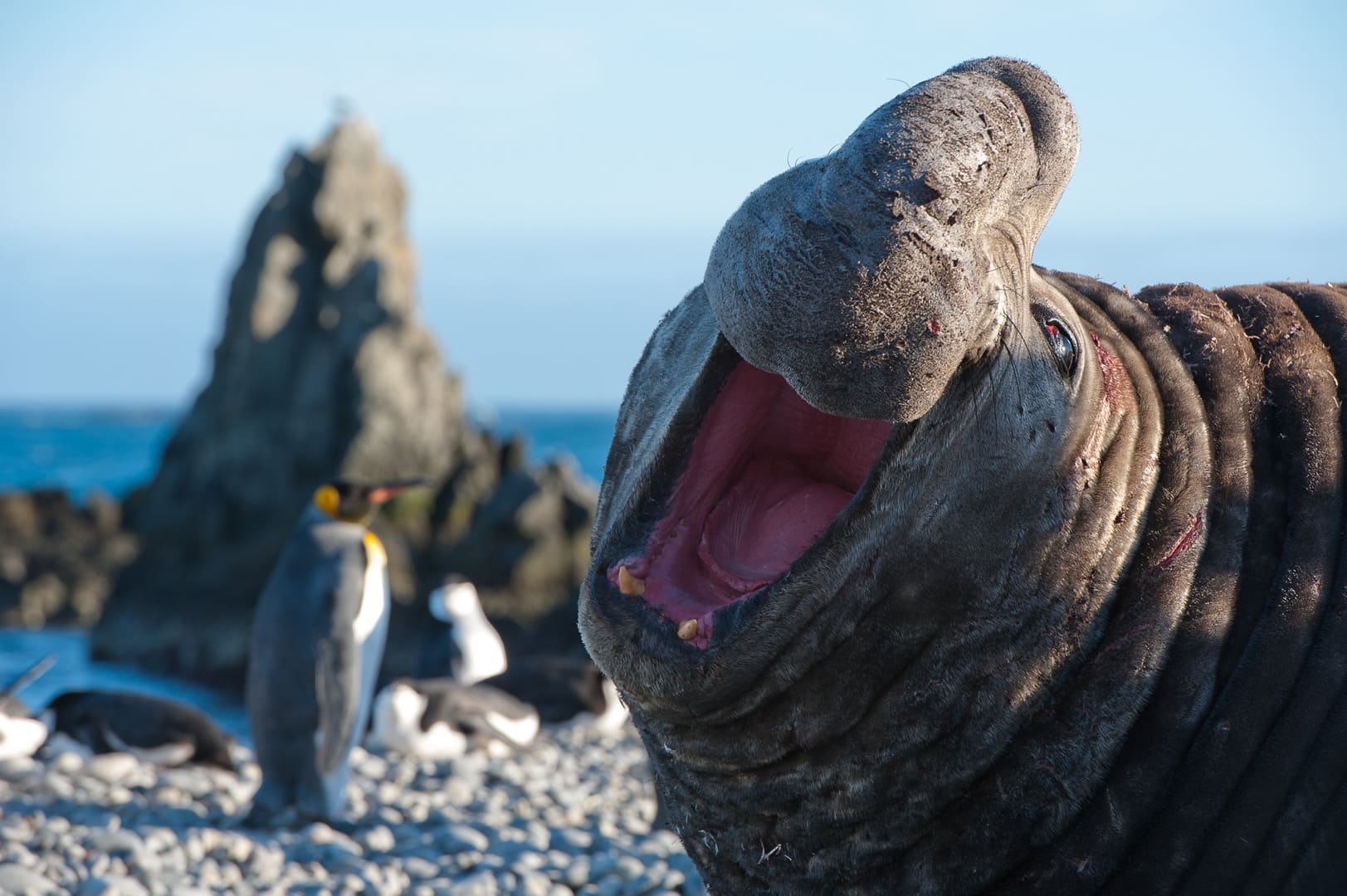 Fast noch gigantischer ist die Subantarktis! Auf Südgeorgien, dem „Galapagos des südlichen Ozeans“, erwarten uns Königspinguinkolonien mit tausenden von Brutpaaren und Jungvögeln, Gruppen von Seeelefanten die um ihr Harem kämpfen oder faul am Strand herumliegen und am Himmel breitet der Wanderalbatros seine Flügel aus.