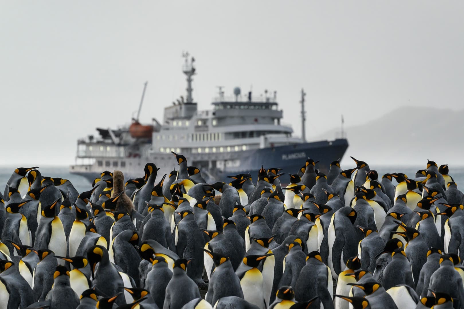 Königspinguinkolonie von Gold Harbour, Südgeorgien. Im Hintergrund das Expeditionsschiff Plancius. (© Vreni & Stefan Gerber)