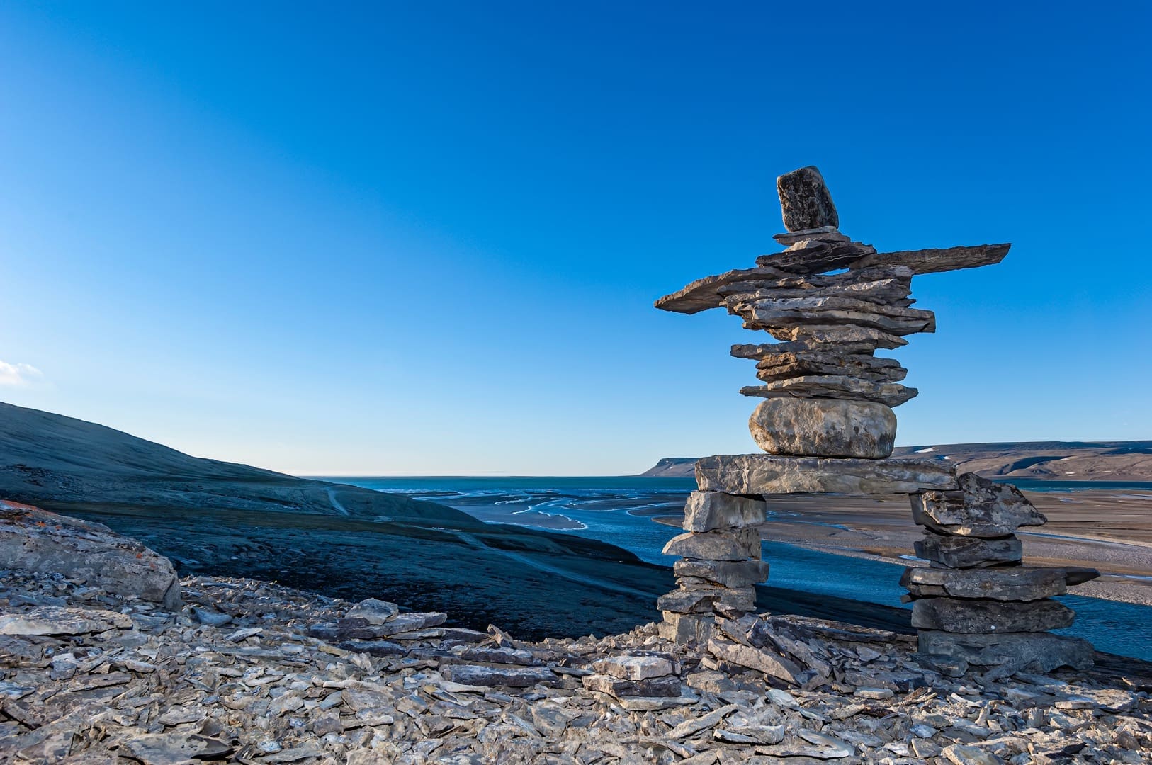 Ein Inuit-Steinmännchen aka "Inukshuk" auf Somerset Island. Die Inukshuk dienen als Wegweiser und Markierungen. (© Gerald Corsi)